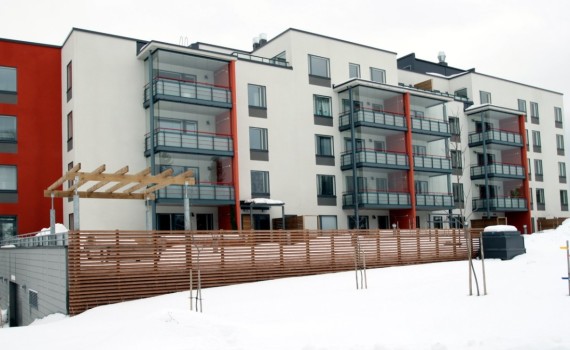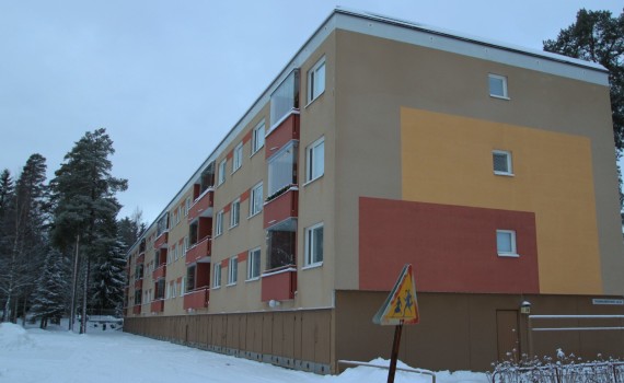 Kerrostalojen julkisivut maalattiin. Parvekelinjat saneerattiin Cembrit kaiteilla ja julkisivulevyillä.